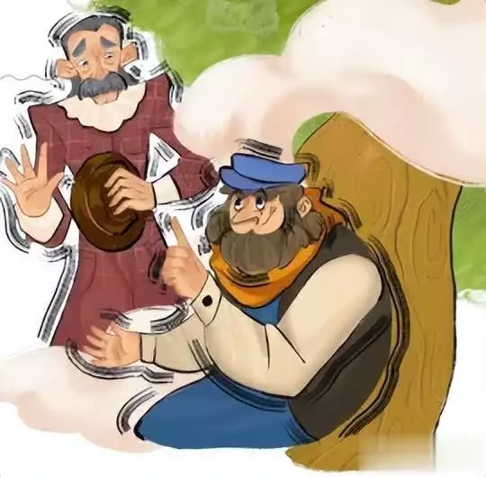 两个人正津津有味地吃着,有个商人路过这里,鞠躬对他俩说:“先生们好!我也是赶路的,带的食物吃光了。我想与两位先生共进午餐,你们不会拒绝吧?我会付给你们钱的。”